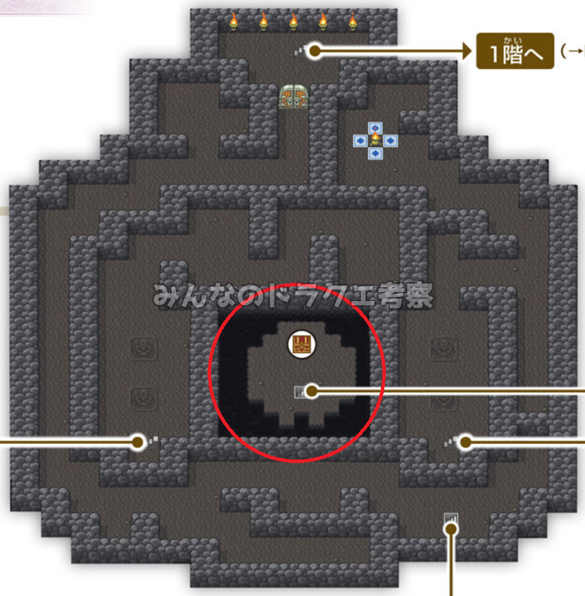 地下1階のひし形で囲われたかがり火と違う所は、かがり火が4つと規模が大きいことと、かがり火の中心に上下に繋がる階段が存在すると言うことです。